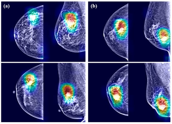 Gradient-weighed class activation mapping for mammograms having breast cancer by (a) DenseNet-169 and (b) EfficientNet-B5.