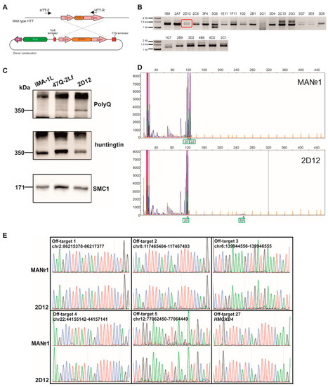 - An, M.C.; O’Brien, R.N.; Zhang, N.; Patra, B.N.; De La Cruz, M.; Ray, A.; Ellerby, L.M. Polyglutamine Disease Modeling: Epitope Based Screen for Homologous Recombination using CRISPR/Cas9 System. PLoS Curr. 2014, 6, 1–19. [Google Scholar] [CrossRef]