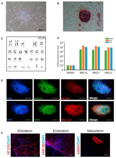 Detailed characterization of the induced pluripotent stem cells (iPSCs) derived from the mutant fibroblasts: (A) Morphology of a primary iPSC colony at 2 weeks after reprogramming initiation; (B) A colony of iPSCs expressing alkaline phosphatase; (C) The karyotype of iPSC clone 69Q-1; (D) Analysis of expression of pluripotency markers by qPCR (n = 3, values for biological replicates are presented as mean ± standard error of the mean); (E) Immunofluorescence staining of iPSC clone 69Q-1 with antibodies against transcription factors OCT3/4, NANOG, and SOX2 and surface antigen TRA-1-60; (F) Immunofluorescence staining confirming the expression of markers of three germ layers’ derivatives after spontaneous differentiation of clone 69Q-1. Scale bars: 100 µm.