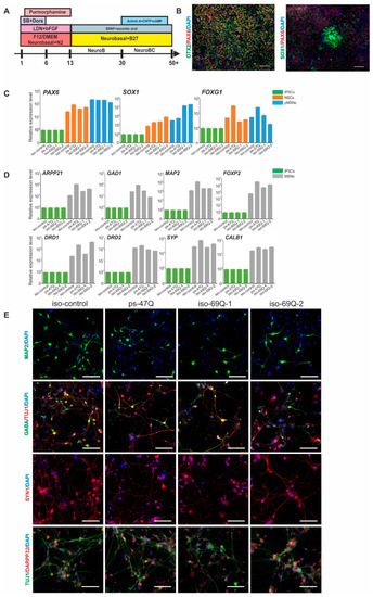 Characterization of the medium spiny neurons (MSNs) that developed from iPSCs: (A) The scheme of the iPSC differentiation into MSNs; (B) Immunofluorescence staining for markers of the early neuroectoderm; (C) Analysis of relative expression of early neuronal markers by qPCR; normalization to the level of expression in iPSCs (n = 3, values for biological replicates are presented as mean ± standard error of the mean); (D) Analysis of expression of MSN markers by qPCR; normalization to the level of expression in iPSCs (n = 3, values for biological replicates are given as mean ± standard error of the mean); (E) Immunofluorescence staining of neurons for markers of mature MSNs. Scale bars: 100 µm.