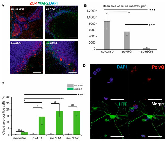 Phenotypic abnormalities in the neural derivatives of the mutant isogenic iPSCs: (A) The neural-rosette formation assay. Immunofluorescence staining for MAP2, a marker of neurons, and ZO-1, a marker of luminal rosettes. The results were reproduced in three independent experiments. Scale bar: 100 µm; (B) Mean area of neural rosettes; * p < 0.05, *** p < 0.001; (C) Increased sensitivity of mutant MSN (medium spiny neuron) progenitors to BDNF (brain-derived neurotrophic factor) withdrawal. Cell death was assessed by immunofluorescence staining with antibodies against activated caspase 3 after the removal of BDNF (n = 3, values for biological replicates are presented as mean ± standard error of the mean). * p < 0.05, ** p < 0.01, *** p < 0.001: a comparison between the cell lines after BDNF depletion; $ p < 0.05, $$ p < 0.01, $$$ p < 0.001: a comparison of one cell line before and after the BDNF depletion; (D) An immunofluorescence assay of neurons for the presence of mutant huntingtin aggregates. Scale bar: 50 µm.
