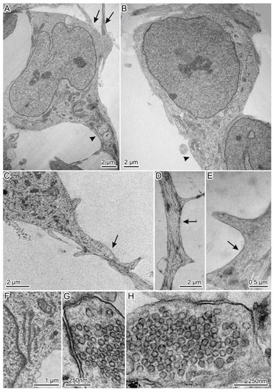 General view of spiny neurons with normal HTT; (A,B) Triangular neurons with large nuclei and an axon and dendrites extending from the first of them; (C–E) Spines on dendrites can be oriented in one or different directions; (F) A Nissl body; (G,H) Synapses contain synaptic vesicles of similar sizes. Axons and dendrites are indicated by arrowheads and arrows correspondingly.