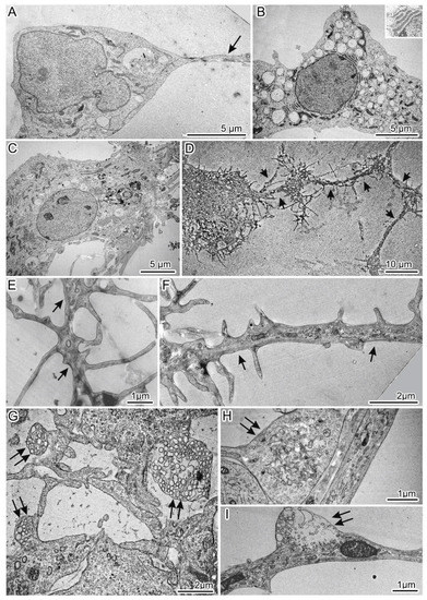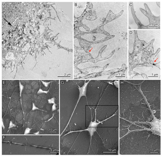 Cell preparation was performed according to a previously described protocol [11]. Cells grown on sterile Milinex plastic substrates (Agar Scientific, Essex, UK) were pre-fixed with 2.5% glutaraldehyde (Sigma-Aldrich, St. Louis, MO, USA) in a culture medium for 15 min, then fixed for 1 h with a 2.5% solution of glutaraldehyde in 0.1 M sodium cacodylate buffer (pH 7.3; Sigma-Aldrich, St. Louis, MO, USA), washed three times with the same buffer, and postfixed with a 1% solution of osmium tetroxide (Aurat) in the same buffer for 1 h at RT. After that, the cells were washed three times with distilled water, incubated in a 1% aqueous solution of uranyl acetate (Serva) for 16 h, and dehydrated in ethanol of increasing concentration (30–96%) and then in acetone. The dehydrated samples were embedded in the Agar-100 epoxy resin mixture (Fluka), which was polymerized at 60 °C for 48 h. Ultrathin sections (50–80 nm) were prepared with a diamond knife on a UCT7 ultramicrotome (Leica Microsystems, Wetzlar, Germany). The samples were analyzed under a JEM1400 transmission electron microscope (JEOL, Tokyo, Japan) at 80 kV at the Center for Microscopy of Biological Objects (Institute of Cytology and Genetics SB RAS, Novosibirsk, Russia, project 0324-2019-0042).