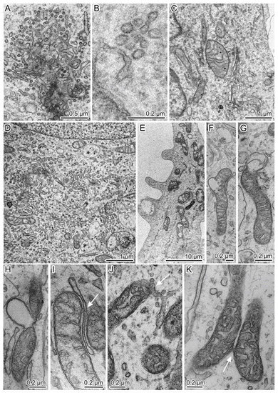 Pathological changes in the organization of cytoplasmic organelles in the mutant neurons of group 1: (A) Dense accumulation of small vesicles near smooth membranes of the ER and Golgi complex; (B) Accumulation of small vesicles near the smooth-ER membranes in a “healthy” control neuron; (C) The Golgi complex in a control cell; (D) High density of small vesicles and actively functioning Golgi cisterns in the cytoplasm of a 69Q neuron; (E–H) Defective mitochondria with a sparse matrix and impaired envelope integrity; (I,J) A contact of defective mitochondria with smooth- ER membranes; (K) A contact between defective mitochondria. Contacts are indicated by white arrows.