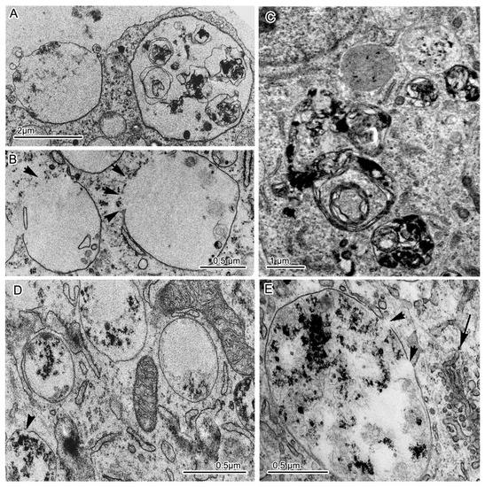 Disruption of the integrity of membranes of light vacuoles and autolysosomes in the cytoplasm of the mutant neurons: (A) The release of the contents of a light vacuole into intercellular space by exocytosis; (B) Breaks in the envelope of light vacuoles (indicated by black arrowheads), leading to the release of their contents into the cytoplasm; (C) Aggregates of autophagosomes and autolysosomes in the cytoplasm of a subtype 2 neuron; (D,E) Disruption of the integrity of the autolysosome membrane (indicated by black arrowheads). The black arrow points to the accumulation of small vesicles near smooth-ER membranes.