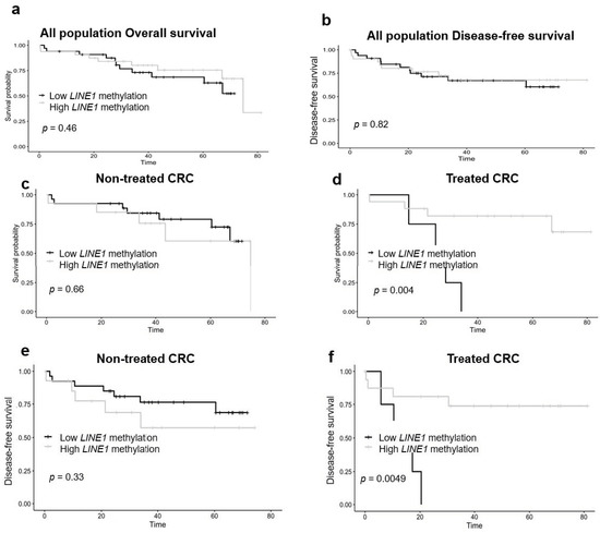 LINE-1 methylation and overall survival analysis according to the neoadjuvant treatment. Kaplan–Meier analysis was performed to determine overall and disease-free survival according LINE-1 methylation (low vs. high) of overall survival and disease-free survival of all populations (a,b), and non-treated (c,e) and treated patients (d,f). Significant differences are conducted according to Wald test (p < 0.05). CRC—colorectal cancer.