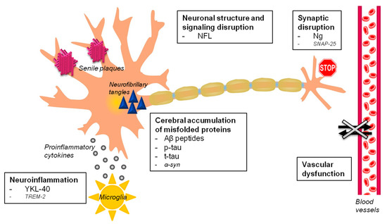 Alzheimer’s disease (AD) is the most common neurodegenerative disease (NDD), with 5.8 million Americans aged 65 years and older living with AD in 2020 [1]. Since Alois Alzheimer’s first description of the typical histological alterations of neuritic plaques (NP) and neurofibrillary tangles (NFT) in 1906 [2], more than eighty years have passed before amyloid beta (Aβ) and phosphorylated-tau (p-tau) were identified as the main component of NP and NFT, respectively [3]. In 1984, the National Institute of Neurological and Communicative Disorders and Stroke-Alzheimer’s Disease and Related Disorders Association (NINCDS-ADRDA) [4] set postmortem examination as the reference standard of AD diagnosis. Since then, the broad phenotypical variability of neurodegenerative diseases (NDDs) has pushed the efforts toward developing a classification based on the main misfolded protein deposition [5,6]. Nevertheless, the occurrence of these aggregates in multiple combinations is frequent, and NDDs are rather emerging as a spectrum of disorders characterized by the loss of proteostasis [7].