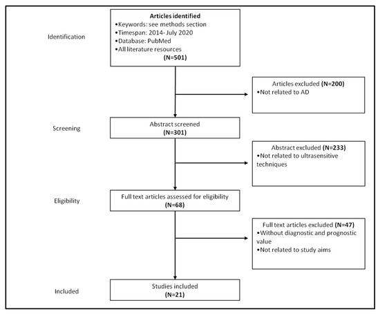 We performed a narrative review of literature focusing on novel candidate fluid biomarkers for AD. A systematic review of literature focused on plasma biomarkers detected by means of novel ultrasensitive techniques was performed in PubMed. We used the combination of the keywords “plasma”, “serum”, “amyloid-β”, “NFL” (neurofilament light chain), “p-tau”, “p-tau181”, “phopsho-tau181”, “phosphorylated tau181”, “t-tau”, “Simoa”, “immunoassay”, “immunomagnetic reduction”, “fully automated”, “immuno-infrared sensor”, “mass spectrometry”, and “multimer detection system”. Only papers in English published between 2014 and July 2020 and focused on AD were included in the final analysis. Overall, we identified 21 studies that provided relevant diagnostic and/or prognostic information (Figure 2). Among them, 10 were focused on amyloid-β peptides, 7 were focused on p-tau or tau or both, and 4 were focused on NFL. For each paper, the study population, the study design (cross-sectional, perspective, retrospective), and the diagnostic and/or prognostic value of the investigated biomarker were analyzed. We classified the diagnostic value of each biomarker according to previously published recommendations as follows: “excellent” (area under ROC curve [AuROC] 0.90–1.00), “good” (AuROC 0.80–0.89), “fair or moderate” (AuROC 0.70–0.79), “poor” (AuROC 0.60–0.69), or “fail or insufficient” (i.e., no discriminatory capacity) (AuROC 0.50–0.59).