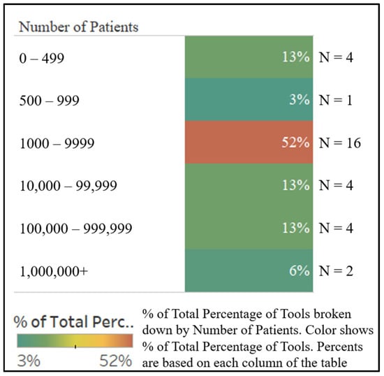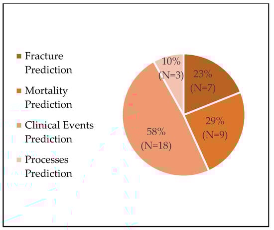 We found that the frequency of orthopedic web-based tool publications has increased over time, with 7% of articles being published before the year 2000, 17% between 2000 and 2010, and the remaining 76% between 2010 and 2020 (Figure 1). Tool development was more often informed by exclusively retrospective studies (n = 17, 55%) than by exclusively prospective studies (n = 12, 39%), with only two tools using both retrospective and prospective data sources (n = 2, 6%). Additionally, the sizes of the studies used in tool development varied greatly, with a median study size of 2216 patients, an average study size of 241,644 patients, and a range of 257–4,726,046 patients (Figure 2). While nearly all tools were used clinical inputs (n = 30, 97%) and demographic inputs (n = 29, 94%), a minority used patient-reported inputs (n = 12, 39%). Age was the most commonly used demographic input (n = 25, 81%), with Sex/Gender as the second-most common (n = 16, 52%). Statistical methods used for the creation of tools varied, with most involving logistic regression or multivariate analysis (Table 4). Categorization of the tools by output yielded the following breakdown: fracture prediction (n = 7, 23%), mortality prediction (n = 9, 29%), clinical event prediction (n = 18, 58%), and processes prediction (n = 3, 10%) (Figure 3). Finally, we found that most tools could be further categorized into orthopedic categories, such as fractures (n = 8, 26%), spine (n = 8, 26%), total joint arthroplasty (n = 5, 16%), oncology (n = 3, 10%), general (n = 5, 16%), and miscellaneous (n = 3, 10%) (Figure 4).