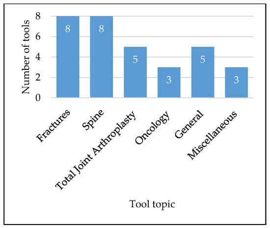 The profile of tools identified in this study indicate two major areas for potential improvement. First, fewer than half of identified tools utilize patient-reported inputs. This may be related to the reliability of obtaining information from patients, as these data require active procurement in prospective cohorts or may not be consistently documented for retrospective cohorts. Despite these barriers, patient reported measures are important components of patient outcomes and ensure physician focus on subjective metrics that patients care about, such as perceived pain. As patient-reported outcome measures are increasingly used in both the field of orthopedics and across medical specialties, greater incorporation of patient-reported data into these tools presents an area of potential improvement. Second, tools identified in this study fall into just a few orthopedic categories, such as fractures, total joint arthroplasty, spine, and oncology. These categories may reflect a lack of tools for other orthopedic subspecialties, such as orthopedic sports injuries. This lack may be related to the heterogeneity of injuries in such fields or insufficient access to large existing patient databases for tool development. Continued expansion in the development of tools across orthopedic subspecialties would afford a wider breadth of resources to orthopedic surgeons to better clinical outcomes for patients and should be a focus of improvement.