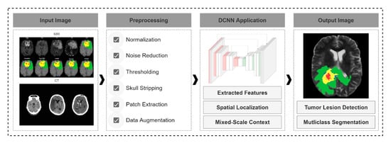Shows suggested roadmap and stages of a typical brain tumor segmentation Architecture with the following high-level steps: 1. Input: magnetic resonance (MRI) and computed tomography (CT) scans are input into the model; 2. Preprocessing: apply several techniques to normalize images, remove noise, and filter irrelevant components; Step 3: Deep Convolutional Neural Network (DCNN) Application: The preprocessed dataset is fed into a DCNN model the extract features for segmentation, with localization a key component; 4. Output Images: Specifies the result of the segmentation model.
