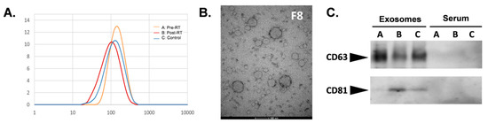 Characterization of serum-derived exosomes. Analysis of the size of vesicles in the size exclusion chromatography (SEC) fraction #8 by the dynamic light scattering (A) and transmission electron microscopy (B). (C) Western blot analysis of CD63 and CD81 in whole serum and serum-derived exosomes (fraction #8) for the three groups of samples (A: pre-radiotherapy (RT), B: post-RT, C: control).