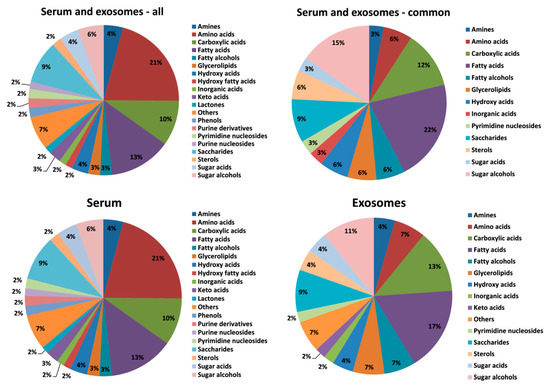 The relative contribution of different classes of metabolites present in serum and serum-derived exosomes (metabolites detected in all types of analyzed samples were considered).