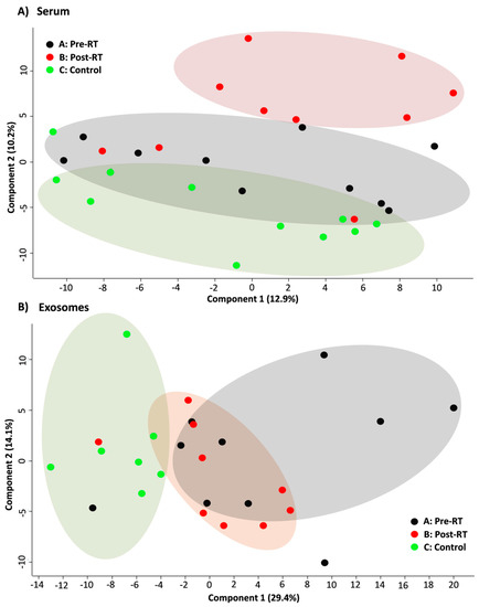 PCA score plots showing the clustering of cancer pre-RT samples A, cancer post-RT samples B, and control samples C. Shown are two the first components responsible for 23.1% of the variability of the serum samples (panel A) and 43.5% of the variability for the exosome samples (panel B).