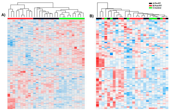 Hierarchical cluster analysis of cancer pre-RT samples A, cancer post-RT samples B, and control samples C. Shown are separate dendrograms for serum samples (panel A) and exosome samples (panel B).