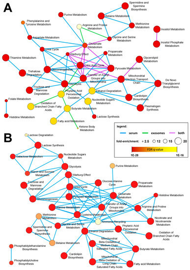 Metabolic pathways associated with specific subsets of compounds detected in the whole serum and serum-derived exosomes. Illustrated are over represented pathways associated with metabolites differentiating between cancer and control samples (panel A) and between pre-RT and post-RT samples (panel B); metabolites that showed large and medium effect size were included. The size of the network nodes corresponds to the pathway’s fold-enrichment while the statistical significance of the over-representation is color coded.