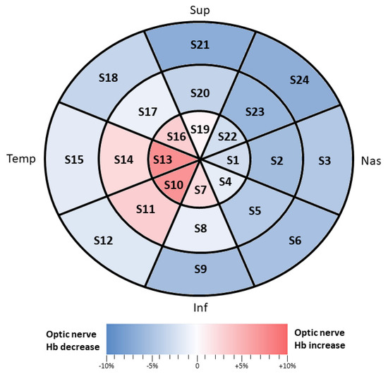 In our study, no significant differences were found in Hb measurements in the ONH between patients with mild AD and controls. In patients with mild AD, there were areas with less optic nerve Hb, especially in the nasal area (in the outer ring in S24 and S3, the intermediate ring in S23 and S2, and the inner ring in S22 and S1). In addition, areas with an increase in optic nerve Hb were found in the temporal region (in the intermediate and inner rings); the largest increase was found in S10 and S13.