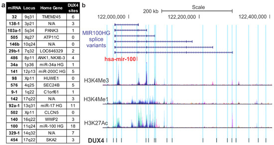 DUX4 binding sites at loci surrounding miRNAs dysregulated in FSHD patients. The 19 miRNAs dysregulated in FSHD1 patient plasma samples were queried for potential regulation by the DUX4 transcription factor, which aberrantly expressed in FSHD, using a DUX4 ChIP-seq dataset [9]. (a) Overview of all DUX4 binding sites within regions capable of acting as regulatory elements (100 kb) of the 19 miRNAs and their home genes. (b) Schematic of DUX4 binding sites within the miR-100 locus and its surrounding home gene (MIR100HG) variants. Note, miR-100 is transcribed from right to left on this image. Corresponding epigenetic modification maps display the location of histone modifications associated with active promoters (H3K4me3) and poised/active enhancers (H3K4me1 and H3K27Ac, respectively).