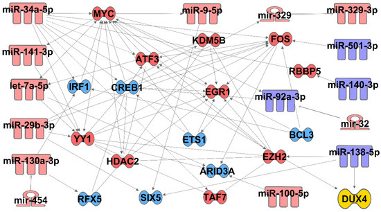Pathway analysis of miRNAs and transcription factors dysregulated by FSHD mutations. Ingenuity Pathway Analysis software was used to identify established connections between candidate miRNAs from this study with transcription factors known to be dysregulated by FSHD-causing overexpression of DUX4 [9]. Red-shaded miRNAs and transcription factors were observed to increase, while those shaded blue were observed to decrease. Solid arrows denote direct relationships, while dashed arrows denote indirect relationships.