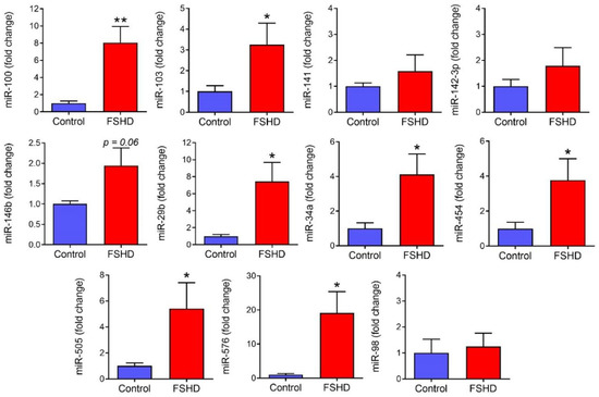 Circulating miRNAs that were significantly up-regulated in individuals affected by FSHD1 were examined in a separate set of non-overlapping CINRG patients used as a validation group. For this group, FSHD patients had a confirmed diagnosis of FSHD1 (n = 12; 9 females, 3 males) and were compared to healthy volunteer control samples (n = 7; 4 females, 3 males). RNA was isolated from 150 µL of plasma using Trizol LS liquid extraction. Total RNA was converted to cDNA using a High Capacity Reverse Transcription Kit with multiplexed RT primers, pre-amplified using PreAmp MasterMix with multiplexed TM primers, and quantified with individual TaqMan assays on an ABI QuantStudio 7 real time PCR machine (Applied Biosystems; Foster City, CA, USA). Assay IDs used are: miR-32-002109, miR-103-000439, miR-505-002089, miR-146b-001097, miR-29b-000413, miR-34a-000426, miR-141-000463, miR-98-000577, miR-576-3p-002351, miR-9-000583, and miR-142-3p-000464. Expression levels of all miRNAs were normalized to the geometric mean of multiple control genes (miR-150 and miR-342-3p) determined previously to be stable circulating miRNA controls [35,51]. Expression was analyzed in FSHD1 versus healthy control patients via t-test analysis, including assessment of directionality. A p-value of ≤ 0.05 was considered significant. Data are presented as mean ± SEM unless otherwise noted.