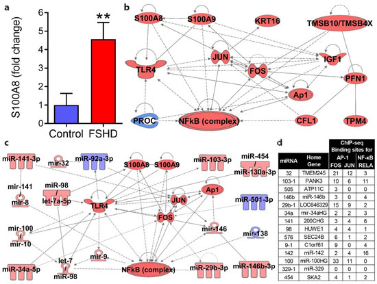 Validation and pathway analysis of elevated S100A8 protein in FSHD. (a) ELISA of S100A8 protein in plasma from a separate validation set of FSHD1 patients. (b) Bioinformatic pathway analysis was used to identify known connections between candidate protein markers with S100A8 pathway proteins involved in TLR4 signaling. (c) Bioinformatic pathway analysis was used to identify established connections between candidate miRNAs with S100A8 pathway proteins involved in TLR4 signaling. (d) Bioinformatic analysis of ChIP-seq defined binding sites for the key S100A8 pathway transcription factors AP-1 (FOS and JUN) and NF-κB (RELA), at potential regulatory regions of the candidate miRNAs that were found to increase in FSHD plasma. Binding sites represent the combined number of potential promoter (within 2 kb of promoter) and enhancer (within 10 kb) regulatory regions with ChIP-seq-confirmed transcription factor binding for each miRNA home gene. (** p ≤ 0.01; n = 13 healthy control volunteers, 19 FSHD1; panels (b,c) produced using Ingenuity Pathway Analysis software, red = increased, blue = decreased; data for panel (d) produced using the Factorbook ChIP-seq data repository from ENCODE and the UCSC genome browser).
