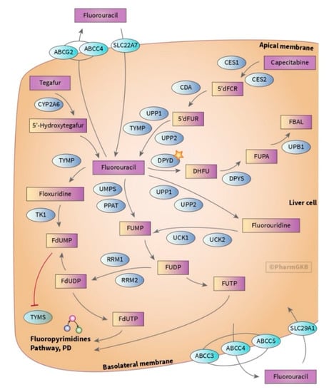 Graphic scheme of the genes involved in the adsorption, distribution, metabolism and excretion (ADME) of fluoropyrimidines []. Capecitabine passes through the gut wall and is metabolised into 5-deoxyfluorocytidine (5′dFCR) and 5’-deoxy-5-fluorouridine (5′dFUR) by carboxyl esterases (CES) and cytidine deaminase (CDA), respectively, and activated into 5-FU by thymidine phosphorylase (TP). - 5-FU is metabolised mostly in the liver by dihydropyrimidine dehydrogenase (DPD) (<80%) into dihydrofluorouracil (DHFU). The secondary elimination pathway is through urinary excretion or catabolism in extrahepatic tissues []. Its mechanism of action involves the methylenetetrahydrofolate reductase (MTHFR)—converting 5,10-methylentetrahydrofolate (5,10-MTHF) into 5-MTHF, which is required for purine and thymidine synthesis, and thymidylate synthase (TS) enzymes—forming a complex with 5,10-MTHF and deoxyuridine monophosphate (dUMP), which in the end disrupts DNA replication and repair. Used with PharmGKB and Stanford University permission (available at https://www.pharmgkb.org/pathway/PA150653776 (accessed on 24 September 2020)).