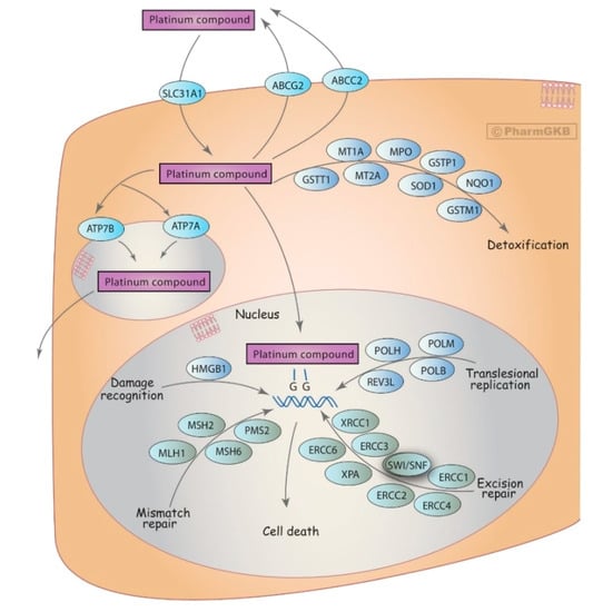 Graphic scheme of the genes involved in the ADME of platinum compounds, including oxaliplatin []. The glutathione S-transferases (GSTs), a multigene family of enzymes, undertake oxaliplatin detoxification. The solute carriers (SLCs) and adenosine-triphosphate binding cassette (ABC) transporters are responsible for oxaliplatin uptake and efflux in the liver, respectively, and so impact on drug bioavailability and toxicity profile. Further, the nucleotide excision repair (NER) and base excision repair (BER) pathways, which include the ERCC1 and ERCC2, and XRCC1 proteins, respectively, repair the damages cause by this drug. Used with PharmGKB and Stanford University permission (available at https://www.pharmgkb.org/pathway/PA150642262 (accessed on 24 September 2020)).