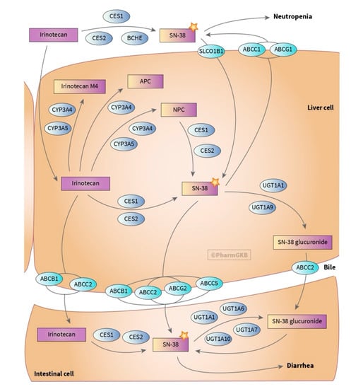 Graphic scheme of the genes involved in the ADME of irinotecan []. Irinotecan is converted into SN-38 by CES, which inhibits topoisomerase I, an enzyme essential for DNA replication and then into inactive SN-38G by UGTs. Further, it can suffer oxidation into 7-ethyl-10-[4-N-(5-aminopentanoic acid)-1-piperidino] carbonyloxycamptothecin (APC), M4 and 7-ethyl-10-[4-(1-piperidino)-1-amino] carbonyloxycamptothecin (NPC) by CYP3A4 and CYP3A5. NPC can be reactivated by CES into SN-38. Irinotecan and its metabolites’ uptake and efflux are conducted by SLCs and ABC transporters, respectively. Used with PharmGKB and Stanford University permission (available at https://www.pharmgkb.org/pathway/PA2001 (accessed on 24 September 2020)).