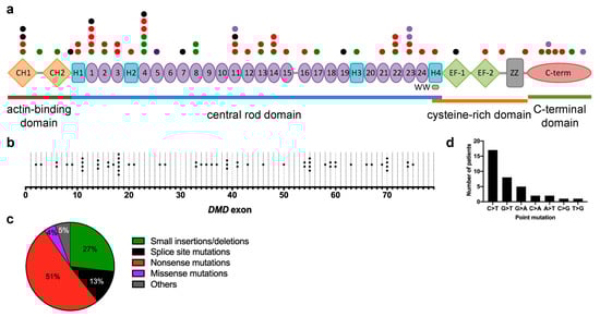 Overview of small mutations in the study population. (a) The positions of small mutations identified in Duchenne and Becker muscular dystrophy (DMD, BMD) patients are shown according to the domain/region of the dystrophin protein they affect, with each dot representing a unique mutation. The color of the dots correspond to the legend in (c); (b) The positions of small mutations, shown according to the DMD exon they are located in; (c) Distribution of DMD small mutations according to type (small insertions/deletions, splice site mutations, nonsense mutations, missense mutations, others); (d) Frequency of point mutation types in DMD and BMD patients. (N = 71).