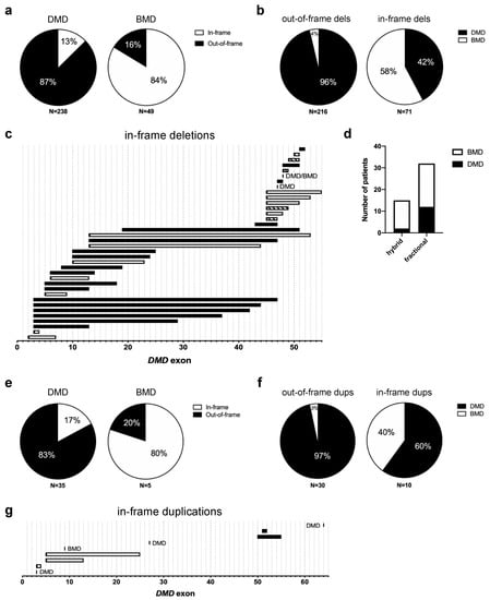 Analysis of large deletions and duplications, and their effect on the DMD reading frame. (a) Distribution of in-frame and out-of-frame deletions in Duchenne and Becker muscular dystrophy (DMD, BMD) patients; (b) Distribution of phenotypes associated with in-frame and out-of-frame deletions; (c) Map of in-frame DMD deletions in DMD and BMD patients, black: DMD, white: BMD, striped: both; (d) Frequencies of DMD and BMD patients with hybrid or fractional repeat-forming in-frame deletions; (e–g) Corresponding plots of (a–c) for duplications in DMD and BMD patients.