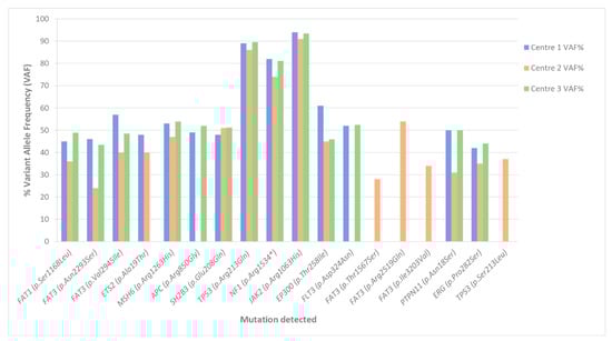 Only the variant reporting process showed small discordances among centers for the custom BCP-ALL panel (described below). Thus, although similar variants and VAF were reported individually by different sequencing centers, some differences in reported variants were found (Figure 1 and Supplementary Table S6). In sample 1, the ETS2 variant found by centers 1 and 2 was not reported by center 3, as it was considered a polymorphism after finding a MAF > 1% in 8 different databases. In sample 2, center 2 missed the APC variant due to the low depth of coverage of this region (only 23 total base reads). In sample 3, three FAT3 variants were reported by center 2, but not by centers 1 and 3, as these variants were considered polymorphisms and filtered out during variant prioritization. Similarly, centers 1 and 3 reported a variant in FLT3 that was not reported by center 2, as it was considered a polymorphism, being reported in 2 databases with a MAF > 1% and presenting only one entry in the COSMIC database. The TP53 variant in sample 4 was only reported by center 2. In this case, discordance was attributed to differences in the transcript choice. The centers used two different transcripts, which had a major effect on the ultimate variant annotation. Thus, center 2 used transcript NM_001126117.1 to annotate this variant, obtaining an exonic missense variant in TP53 (p.(Ser213Leu); c.638C > T). In contrast, center 1 and 3 used transcript NM_000546.5, thus obtaining an intronic variant (c.993 + 309C > T), which was filtered out during the variant prioritization.