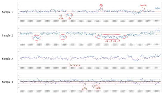 CNV analysis confirmed the presence of alterations previously identified by karyotype and/or Multiplex Ligation-Dependent Probe Amplification (MLPA). Sample 2 showed the loss of chromosomes 3, 7, 13, 15, 16, and 17, consistent with the corresponding monosomies and the low hypodiploidy observed in the karyotype and the pattern obtained by the MLPA, P181, and P182 kits. Additionally, the custom panel detected a focal deletion of IKZF1, loss of 9p, and gains of RB1 and MAPK1 in sample 1, loss of CDKN2A/B in sample 3, and loss of ETV6, BTG1, and SH2B3 genes in sample 4 (Figure 2). Most of those abnormalities had been previously identified by using the MLPA P335, P181, and P182 kits.