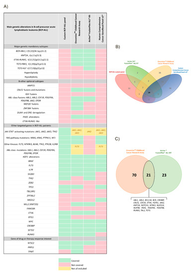 Thus, four NGS-targeted panels were tested: (1) the BCP-ALL custom panel; (2) Archer® FusionPlex® ALL kit (ArcherDX, Boulder, CO, USA); (3) OncomineTM Childhood Cancer Research Assay (OCCRA) (ThermoFisher Scientific, Waltham, MA, USA); and (4) Human Comprehensive Cancer GeneRead Panel v2® (Qiagen, Hilden, Germany), using Illumina (San Diego, CA, USA) and Ion Torrent (Gilford, NH, USA) platforms.
