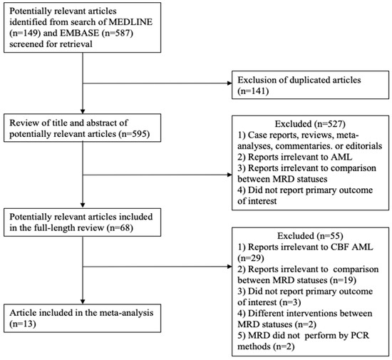 A total of 736 potentially relevant articles were identified during a search of the MEDLINE (n = 149) and EMBASE (n = 587) databases. Of those, 141 duplicate articles were excluded. The 595 remaining potentially relevant articles were then reviewed by two investigators, and case reports, reviews, meta-analyses, commentaries, and editorials were excluded. Remaining reports that were unrelated to AML, that lacked data from a comparison between MRD negative and positive status, or that did not report the primary outcome of interest were also excluded. A full-length review of the remaining 68 potentially relevant articles was then performed. This review excluded 55 additional reports that were unrelated to CBF-AML, that lacked a comparison between MRD statuses, that did not report the primary outcome of interest, that reported different interventions between the two MRD status groups, or that evaluated MRD status via a method other than polymerase chain reaction (PCR). The remaining 13 studies were included in this meta-analysis. The literature review and selection process are described in Figure 1.