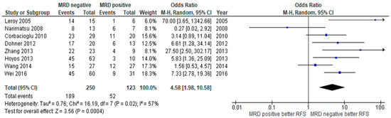 Forest plot of studies comparing relapse-free survival (RFS) between MRD negative patients and MRD positive patients.