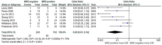 Forest plot of studies comparing cumulative incidence of relapse (CIR) between MRD negative patients and MRD positive patients.