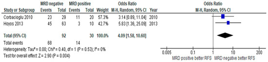 We finally evaluated the cutoff as a parameter of MRD assessment. The most commonly used in this meta-analysis was 1 × 10−3 [17,18,25,26,28]; therefore, we also performed subgroup analysis, selecting only the studies with this cutoff. The MRD negative group had inferior CIR outcome when compared to the patients with MRD positivity, with a pooled OR of 0.12 (95% CI: 0.03–0.52, p = 0.004, I2 = 0%). However, there was no statistically significant difference in RFS outcome between both groups with this cutoff point (Supplementary Data 5) [17,18,25,26,28].