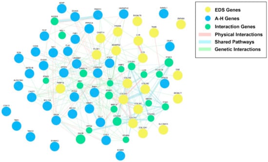 We took the 35 autism/hypermobility (A–H) genes, together with the 19 EDS genes, and ran them through GeneMANIA to produce an extended gene interaction network based on direct physical interactions between proteins, shared pathway involvement, and genetic interactions [44] (see Supplementary File S1, Table S4). As can be seen in Figure 1, the EDS and A–H genes cluster extensively, suggesting substantial interactions between these gene networks and a potential mechanism for phenotypic overlap between autism and hypermobility-related disorders.