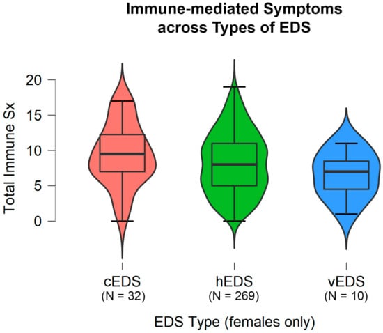 Violin plot indicating the number of reported immune-mediated symptoms across hypermobile EDS (hEDS), classic EDS (cEDS), and vascular EDS (vEDS). Data originally reported in Casanova et al., (2020). Only data for female participants were utilized for the analysis due to low numbers of males in the hEDS group, a condition that is extremely heavily sex skewed towards women.