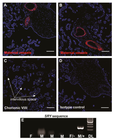 Sushi-domain-containing-2 (SUSD2+) mesenchymal stromal cells (MSCs) in human term placentae. Middle cotyledon from human term placental sections containing maternal vessels immunostained with SUSD2 (red) showing a perivascular location (A,B) with no immunostaining in the foetal chorionic villi. V, villi; intervillous space, arrows (C). Panel (D), isotype control. Scale bars = 200 µm. (E) PCR gel image showing no SRY genomic DNA (gDNA) bands in 4 placental decidua basalis MSC (pMSC) lines in the first four columns, indicating the absence of male foetal cells in the pMSC cultures. F, donor delivered female baby; M, donor delivered male baby; F/−, female negative control cells and M/+, male positive control cells for SRY primers. DL, 100-bp DNA ladder.