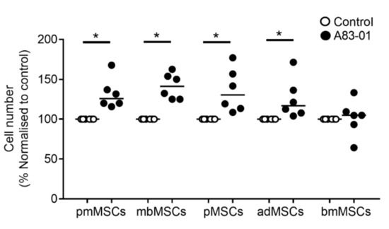A83-01 promotes MSC proliferation. P6-cultured postmenopausal MSCs (pmMSCs), menstrual blood MSCs (mbMSCs), pMSCs and bone marrow MSCs (bmMSCs) and P4 adipose tissue MSCs (adMSCs) were treated with and without A83-01 in 5%O2/5%CO2/90%N2 for 7 days. The cell number obtained was normalised to the DMSO vehicle control (set to 100%) for n = 6 biological samples for each tissue type. Bars, medians. * p < 0.05.