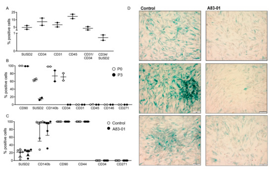 A different isolation process was performed for adipose tissue based on the surface profile of adipose tissue-derived MSCs reported in the literature [37,38]. The adipose tissue stromal vascular fraction (SVF) consisted of 4.7% SUSD2+, 12.3% CD34+, 8.3% CD31+ and 19.5% CD45+ cells, with 3.5% of cells both CD31+ and CD34+, while 0.75% were both CD34+ and SUSD2+ (Figure 4A). The overlap of CD34+ cells in adipose tissue SVF with endothelial cells highlights the need for their negative selection to obtain a pure population of adMSCs. Surface marker profiles of adMSCs were also assessed following the culture of CD34+CD31−CD45− adMSCs at P0 and P3. The percentage of CD90+adMSCs was high (Figure 4B) (100% at P0 and 98% at P3), similar to other MSCs, and did not change even at P4 (Figure 4C). Cultured adMSCs were negative for CD31, CD45, CD146 and CD271 surface markers (Figure 4B). At P0, 64% and 98% of adMSCs were SUSD2+ and CD140b+, respectively, which decreased to 15% and 74% by P3 (Figure 4B). Similarly, 71.5% of P0-cultured adMSCs were CD34+, but by P3, none were. At P4, 19% of adMSCs were SUSD2+, 80% CD140b+, 100% CD90+, 100% CD44+, 0% CD34+ and 0% CD271+, and there was no change in the percent of positive cells for all these surface markers following treatment with A83-01 (Figure 4C).