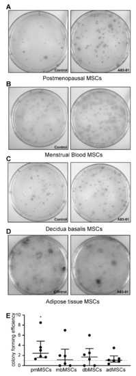 Colony-forming efficiency of MSCs treated with (treatment group, right panels) and without (control group, left panels) A83-01 in serum-free medium (SFM). (A–D) Representative culture plates of (A) postmenopausal, (B) menstrual blood, (C) placental and (D) adipose tissue MSCs seeded at a clonal density of 50–100 cells/cm2. (E) Graph showing colony-forming efficiency of P6 MSCs (pmMSCs, mbMSCs, pMSCs and P4 adMSCs pretreated with and without 1-µM A83-01 for 7 days, followed by low-density clonal culture in SFM for 3 weeks. The colony-forming efficiency was normalised to the corresponding control of each tissue. Data are medians with interquartile ranges of n = 6 different patient samples. * p < 0.05.