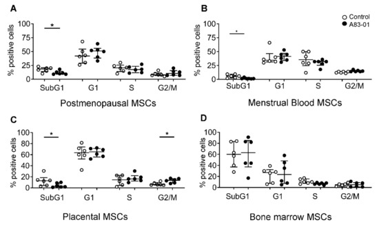 To investigate the cell cycle stage profiles of MSCs treated with and without A83-01, PI-stained cells were assessed by flow cytometry. The treatment with A83-01 decreased the percentage of apoptotic cells (SubG1 phase) in MSCs from the postmenopausal endometrium, menstrual blood and placenta (Figure 6A–C). There was also a significant increase in the G2/M phase (mitotic cells) in the pMSCs treated with A83-01. Unlike all other MSCs tested, there were no differences in any cell cycle phase in bmMSCs, although 63% of cells were in the SubG1 phase in both A83-01-treated and the untreated control, indicating that a substantial proportion of cultured bmMSCs were apoptotic (Figure 6D).