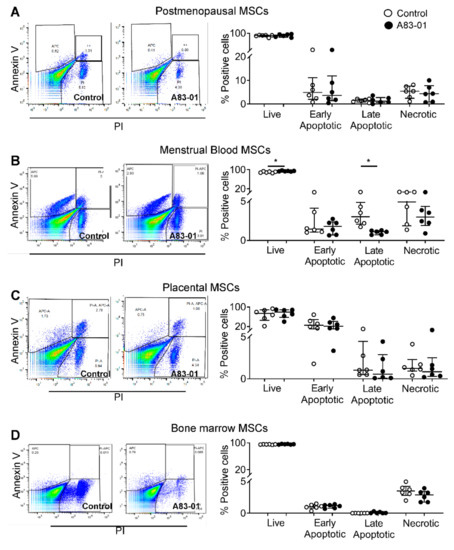 Analysis of apoptotic cells in A83-01-treated and untreated MSCs using Annexin V-PI. The graphs show the percentage of live (Annexin-V−/PI−), early (Annexin-V+/PI−) and late-apoptotic (Annexin-V+/PI+) and necrotic cells (Annexin-V−/PI+) in A83-01-treated and untreated MSCs from (A) pmMSCs, (B) mbMSCs, (C) pMSCs and (D) bmMSCs (while circles, control and black circles, A83-01). Left panels show representative flow cytometry dot plots for the control and A83-01 cells for each cell type. Data are medians with interquartile ranges of n = 6 different patient samples. * p < 0.05.