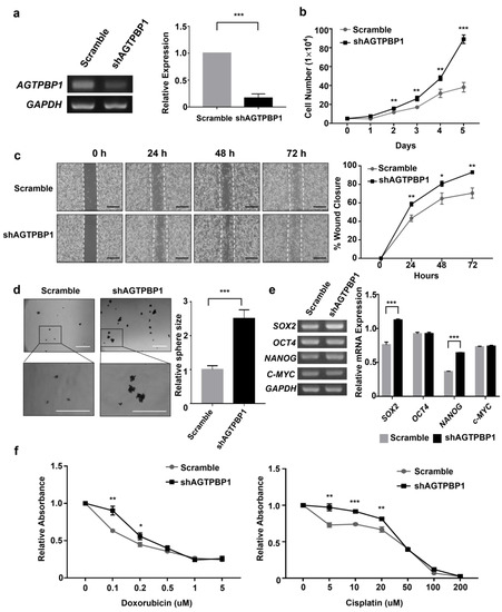 A distribution pattern of AGTPBP1 expression in diverse normal tissues obtained from HPA [36] revealed that the mRNA expression level of AGTPBP1 was higher in lung tissue and in bone marrow, cerebral cortex, granulocytes, and testis, as compared to that in other tissues (Supplementary Figure S1). To assess the role of AGTPBP1 in lung cancer cell, we interfered AGTPBP1 expression in A549 cells using AGTPBP1-targeted shRNA. RT-PCR analysis confirmed that shAGTPBP1 treatment decreased AGTPBP1 expression by approximately 80% (Figure 1a). We compared cancer cell growth between control and AGTPBP1-silenced A549 cells for five days. The number of surviving cells was significantly increased by AGTPBP1 knockdown at days 2, 3, 4, and 5 (Figure 1b). Cell migration assay revealed that the wound closure rate was significantly higher in AGTPBP1-silenced A549 cells at 24, 48, and 72 h (Figure 1c). In addition, the spheres formed by AGTPBP1-silenced cells were larger than those formed by control cells (Figure 1d). As sphere formation reflects the self-renewal capacity of tumor cells, we analyzed stemness marker genes, SOX2, OCT4, NANOG, and c-MYC. Among these, SOX2 and NANOG were significantly upregulated in AGTPBP1-silenced A549 cells, as compared to control, whereas no differential expression of OCT4 and c-MYC was observed between AGTPBP1-silenced cells and control cells (Figure 1e). Moreover, drug resistance of AGTPBP1-silenced A549 cells was intensified by treatment with the two commonly used cancer chemotherapeutic drugs, doxorubicin and cisplatin (Figure 1f). Overall, knockdown of AGTPBP1 enhanced the oncogenic characteristics, including proliferation, migration, self-renewal, and drug-resistance, of A549 lung cancer cells, suggesting that AGTPBP1 had a tumor-suppressing ability and could modulate the progression of LUAD.
