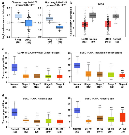 The tumor-suppressive effects of AGTPBP1 suggest that the expression of AGTPBP1 is reduced during lung oncogenesis. To examine the expression of AGTPBP1 in lung cancer tissues and its adjoining normal tissues, datasets from Oncomine and TCGA databases were utilized. These included the Okayama dataset [37] with 20 normal lung tissues and 226 LUAD, and the Hou dataset [38] with 65 normal lung tissues and 27 LUSC. In both datasets, mRNA expression of AGTPBP1 was significantly downregulated in lung carcinomas (Figure 2a). In the TCGA data from GEPIA web tool, AGTPBP1 expression was downregulated in two types of NSCLC, as compared to its normal tissue counterparts (Figure 2b). To investigate the correlation between the mRNA level of AGTPBP1 and the clinicopathological characteristics of lung cancers, we analyzed TCGA datasets using the UALCAN tool. Interestingly, AGTPBP1 expression was upregulated independently of the stage of cancer (1–4) and patient age (21–40, 41–60, 61–80, and 81–100). AGTPBP1 expression was significantly downregulated regardless of the stage of cancer in both LUAD and LUSC (Figure 2c). Moreover, AGTPBP1 expression was significantly downregulated in the lungs of patients with LUAD and LUSC of all age groups as compared to those with normal lung tissues (Figure 2d). Analysis of other clinicopathological characteristics, including the race of the patient (Caucasian, African-American, and Asian), gender (male and female), nodal metastasis status (0–3), smoking habit, TP53 mutation status, and histological subtypes, showed that the mRNA level of AGTPBP1 was significantly lower in LUAD and LUSC patients regardless of clinicopathological characteristics (Supplementary Figures S2 and S3).