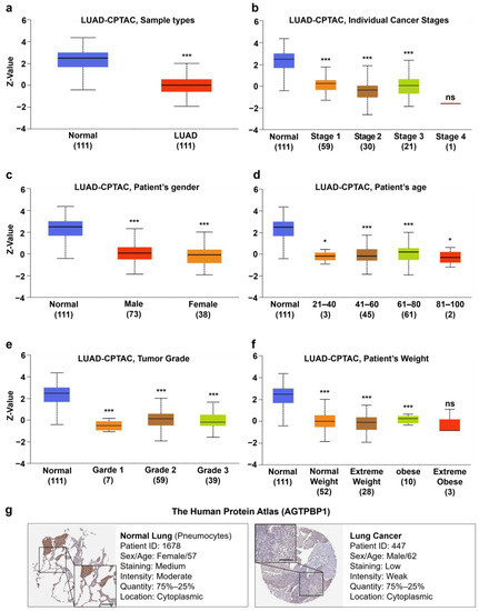 To evaluate the protein expression level of AGTPBP1, we accessed the CPTAC dataset using UALCAN. In the CPTAC dataset, AGTPBP1 protein expression was downregulated in primary LUAD regardless of the clinicopathological characteristics, including cancer stage, the patient’s race, gender, age, weight, and tumor grade (Figure 3a–f). Moreover, we observed that 3 out of 12 lung cancer tissues, including that of patient ID 447, showed a low level of staining for AGTPBP1, whereas immunohistochemistry data from HPA showed moderate cytosolic staining for AGTPBP1 in normal lung tissues (Figure 3g). Altogether, these results indicated that the mRNA and protein expression levels of AGTPBP1 were lower in lung cancer tissues, as compared to its neighboring normal tissues.