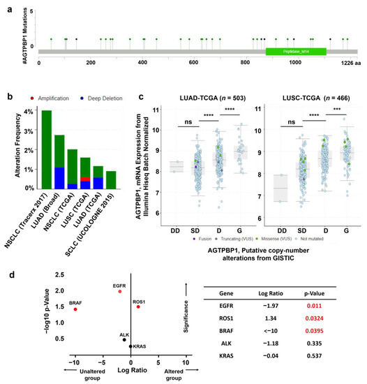 To identify the alteration frequency of AGTPBP1 gene in LUAD, we analyzed mutations and CNAs of AGTPBP1 in a cohort of 4268 patients with lung cancer using the cBioPortal web. A total of 38 mutations in the AGTPBP1 gene were identified among lung cancer samples; the mutations were evenly distributed in all regions, including zinc carboxypeptidase, which belongs to the M14 peptidase family with 874–1107 amino acids (Figure 4a). Moreover, the alteration frequency of AGTPBP1 was 4% in the TRAcking Cancer Evolution through therapy (TRACERx) dataset and 3% in the Broad Institute dataset. Deep deletion was predominantly appeared in approximately 0.2–1% of the patients in the Broad Institute and TCGA datasets (Figure 4b). CNAs in LUAD and LUSC were significantly correlated with AGTPBP1 expression. Moreover, a significant proportion of patients exhibited shallow deletion of AGTPBP1, and significantly lower AGTPBP1 expression as compared to those with diploid CNA status (Figure 4c). These data suggested that shallow deletion of AGTPBP1 could be partially responsible for the reduced AGTPBP1 expression in lung cancer. Co-occurrence of mutation in AGTPBP1 and other altered biomarkers EGFR, KRAS, BRAF, ALK and ROS1 in lung cancer was analyzed (Figure 4d). ROS1 alteration patient samples were significantly counted in the AGTPBP1 altered group, whereas EGFR and BRAF mutated patients was predominant in AGTPBP1 unaltered group. Overall, these results suggested that alteration of AGTPBP1 could be associated with lung cancer.