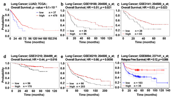The effects of AGTPBP1 knockdown suggest the suppressive role of AGTPBP1 in tumor progression. Therefore, we analyzed the relationship between AGTPBP1 expression and prognosis in lung cancer using gene expression datasets. The association between AGTPBP1 expression and the survival of patients with lung cancer was examined using R2: Genomics Analysis and Visualization Platform, KM-plotter, and PrognoScan database. The LUAD dataset in TCGA database was analyzed using R2: Genomics Analysis and Visualization Platform. In the LUAD-TCGA dataset, AGTPBP1 expression positively correlated with overall survival (Figure 5a). To examine the relationship between patient survival and AGTPBP1 expression in other datasets, we utilized the KM-plotter and analyzed results using univariate analysis with a p-value threshold < 0.05. Four different datasets, including GSE19188 [38], GSE3141 [39], GSE31210 [37], and GSE30219 [40], also displayed positive correlation between overall survival and AGTPBP1 expression (Figure 5b–e). Additionally, in the GSE8894 [41] dataset of PrognoScan web tool, AGTPBP1 expression level positively correlated with relapse-free survival (Figure 5f). Therefore, AGTPBP1 expression showed a significant positive correlation with patient survival in multiple datasets of patients with NSCLC, suggesting a tumor-suppressive role of AGTPBP1.